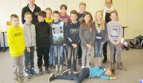 »Was tun im Notfall?« Bei dieser Frage war sich die Gruppe sehr schnell einig: »Notruf!«. Schritt für Schritt erarbeitete sich die Gruppe das richtige Verhalten in einem Notfall. Doch nicht nur dieser Fall wurde durchgespielt, sondern auch die Frage: »Worauf muss ich achten, wenn ich alleine mit dem Fahrrad unterwegs bin?« Christian Armbruster riet den Schülern und Schülerinnen: »Wenn ihr alleine unterwegs seid, sagt vorher zuhause Bescheid, welche Strecke ihr fährt!«