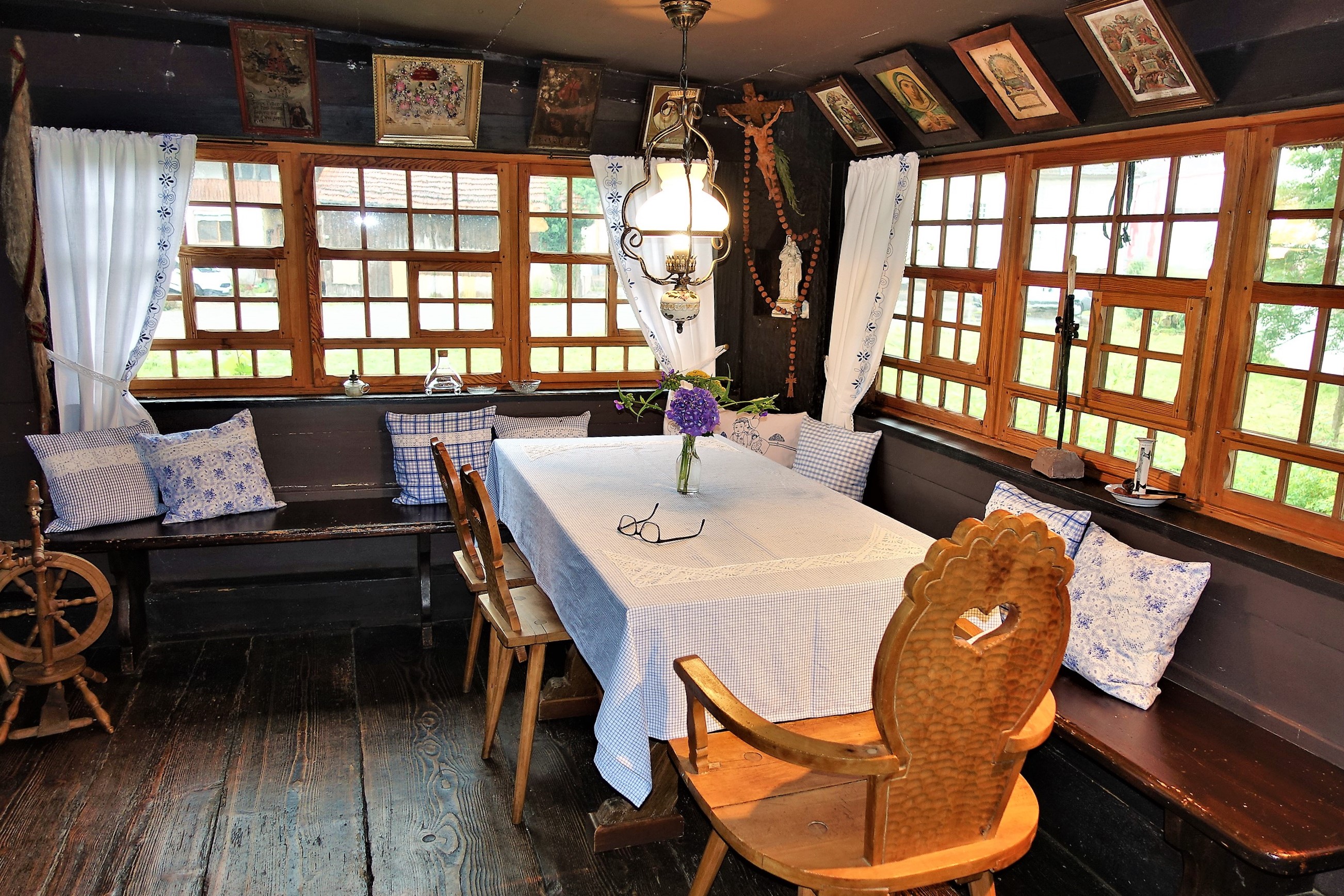 Beeindruckend ist die mächtige Stube mit der leicht gewölbten Decke, in der sich die Bauernfamilie mit ihren Mägden und Knechten am großen Tisch unter dem Herrgottswinkel zum Essen traf.
