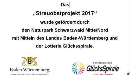 Für die Durchführung des Vorhabens Streuobstprojekt 2017 wurde eine Förderung vom Naturpark Schwarzwald mit Mitteln des Landes Baden-Württemberg und der Lotterie Glücksspirale in Höhe von 4.187,00 € gewährt.