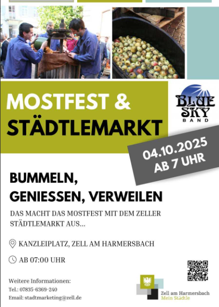„Traditionell sensationell – das ist das Mostfest in Zell“, berichtet Klaus Kienzle, von der Fasendgemeinschaft Neuhausen, strahlend und freut sich auf das Event. Bereits zum 17. Mal organisieren die „Neuhuser Mostbuebe und Mostmaidle“ das Mostfest – und das ist ein Erlebnis für große und kleine Besucher. Strahlende Kinderaugen beim Drehen der Mostpresse und die Erkenntnis: Apfelsaft wird tatsächlich aus richtigen Äpfeln gemacht, kommt nicht aus dem Tetrapack und schmeckt einfach super lecker. Lecker sind auch die Gaumenfreuden, die die „Mostbuebe und Mostmaidle“ bereithalten: frischer Apfel- und Zwiebelkuchen, frischgepresster Apfelsaft, letztjähriger Most aus Neuhauser Südhanglage und natürlich prickelnder Apfel-Royal nach „Neuhuser“ Geheimrezept.