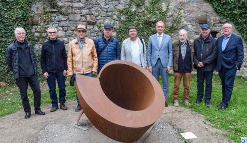 Wolfgang Hilzensauer erläuterte die neue Kunst, die ab sofort in Zell zu sehen ist. Christoph Traub steuerte nahe des Rundofens zwei Basaltsteinskulpturen bei, welche die Kraft und Beständigkeit der Natur widerspiegeln. Rüdiger Seidt stellt zwei markante Werke aus Cortenstahl zur Verfügung, die im spannenden Kontrast zur Umgebung stehen. Mit Holz arbeitet Karl Walter Loth. Seine Werke stehen für organische Lebendigkeit. German Roesz hat eine dynamische Skulptur, ebenfalls aus Cortenstahl, geschaffen. Eine Schenkung von Dietrich Schön in Form von zwei filigranen Gusseisen-Skulpturen ergänzt die Kunst im Park vor der Villa Haiss. Ebenfals eine Schenkung ist eine Bronzeskulptur, geschaffen von Walter Haaf und im Stadtpark aufgestellt. „Tragbar“ heißt schließlich ein Werk des Künstlers Michael Steigerwald, hergestellt aus Holz des Zeller Mammutbaums. Sie ist laut Hilzensauer Symbol für Toleranz und Zusammenhalt und steht vor der Wallfahrtskirche.