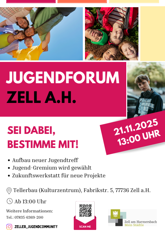 Alle Jugendlichen ab der 5. Klasse sind zum Zweiten Zeller Jugendforum herzlich eingeladen. Die Anmeldeformulare werden rechtzeitig sowohl online als auch in Papierform zur Verfügung gestellt. Informationen hierzu folgen ebenso zeitnah. Auf den Anmeldebögen können sich interessierte Jugendliche bereits als Kandidaten zur Wahl des neuen Jugendgremiums aufstellen lassen. Auch hierzu laden wir alle Interessierten Jugendlichen herzlich ein.