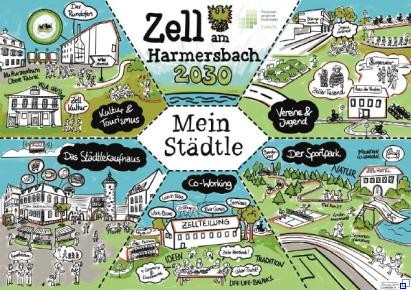 Aus der Analyse der Informationen des Szenario-Prozesses mit Bürgerbeteiligung und Szenario-Werkstätten ist eine Zukunftsgeschichte entstanden – das Szenario Zell 2030. In dieser Geschichte wird von der Zukunft Zells erzählt und wie es in 13 Jahren aussehen könnte. Dabei soll die Geschichte nicht als abschließendes Strategie- oder Handlungskonzept verstanden werden, sondern ist in entsprechende Konzepte zu übersetzen oder muss mit ihnen verbunden werden. Einzelne Inhalte werden nicht ohne weiteres 1:1 übernommen. Sie stehen vielmehr für grundsätzliche Ziele, Handlungsfelder und mögliche Maßnahmen. Diese Zukunftsgeschichte, für welche das Bild unten steht, ist vertont und visualisiert. Nehmen Sie sich bitte etwas Zeit und lassen sich berieseln.